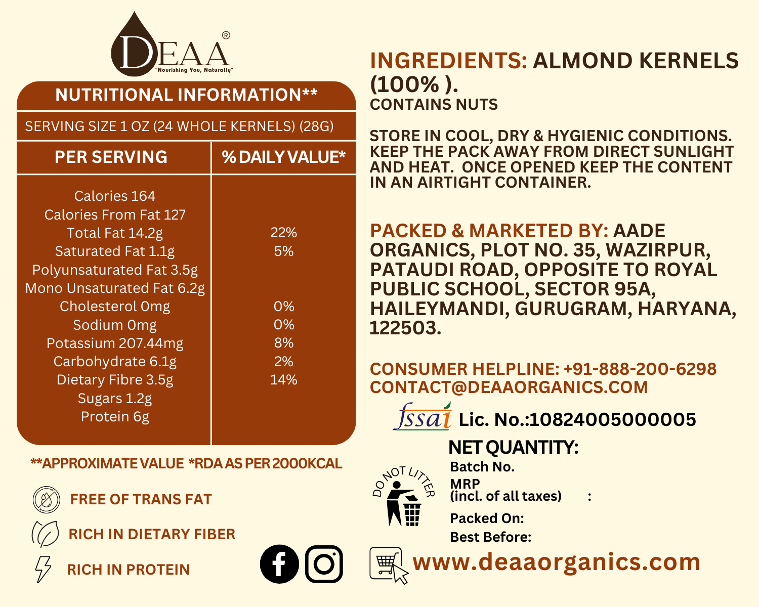 Introducing DEAA California Almonds, a golden treasure straight from the sunny orchards of California. Immerse yourself in the delectable crunch of premium almonds, handpicked for their size, flavour, and nutritional richness. Elevate your snacking experience with the finest quality dry fruits, brought to you by DEAA.