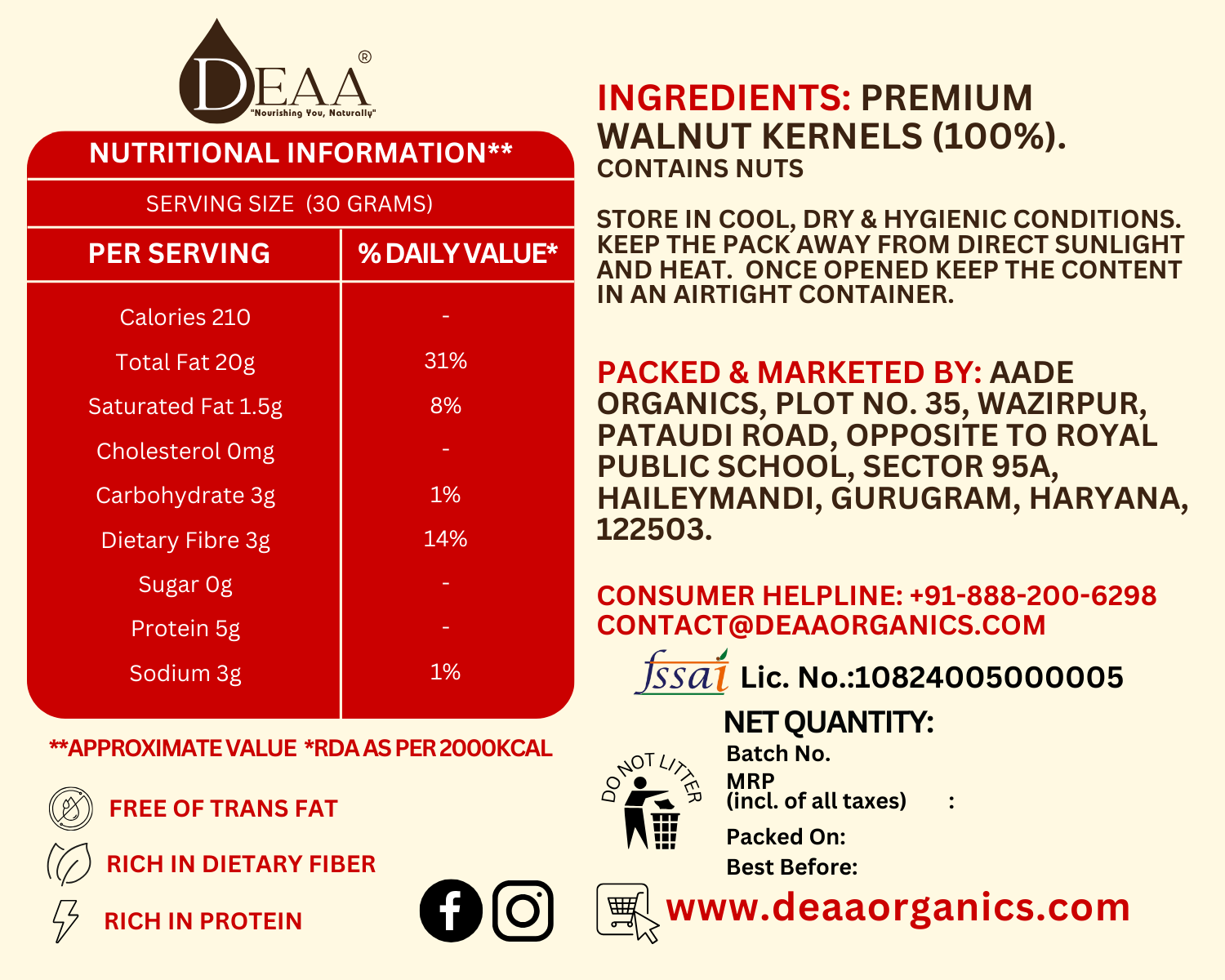 🚫 No Additives: Enjoy the pure, natural flavour of walnuts with DEAA, as our nuts are free from preservatives, additives, and artificial Flavors, providing an authentic and wholesome snacking experience.