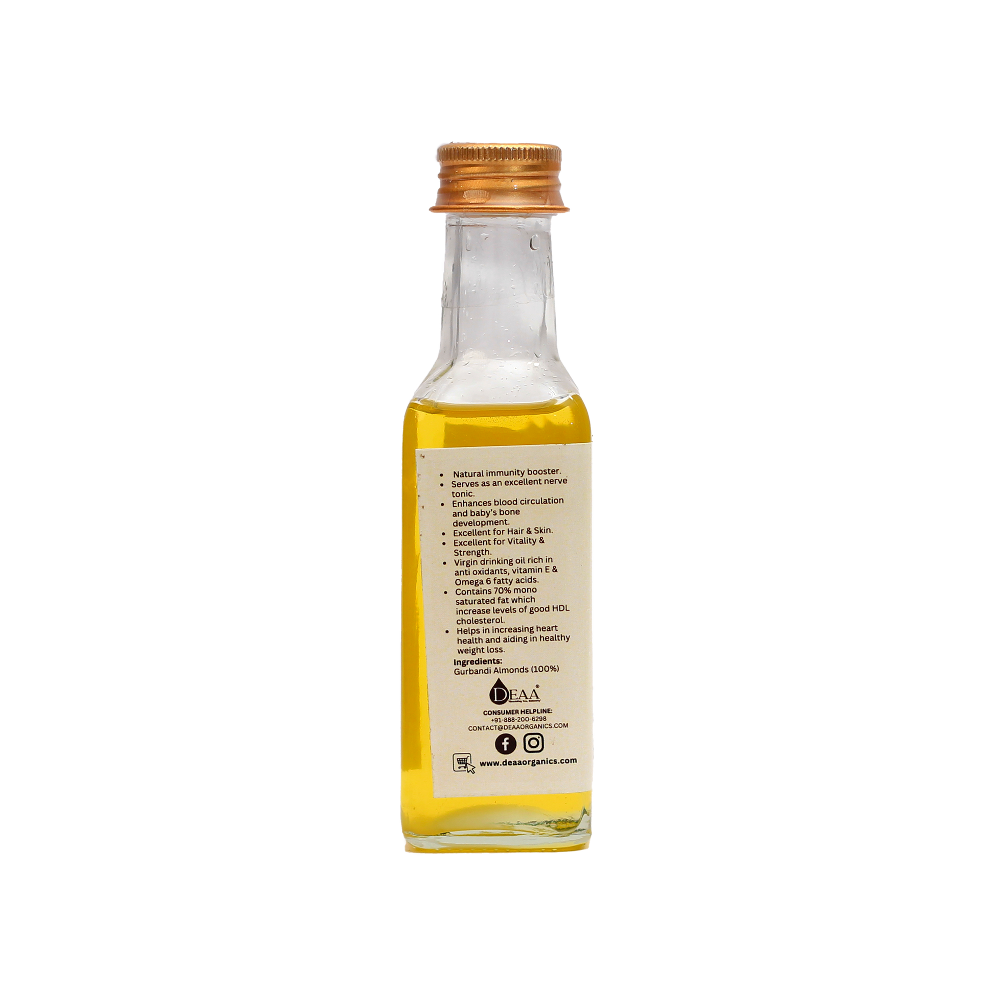 DEAA Wood-Pressed Almond Oil, meticulously crafted from the finest almonds using traditional cold-pressed methods. This pure, additive-free oil is rich in essential nutrients, antioxidants, and Vitamin E, promoting overall health and radiant skin. Perfect for enriching your skincare & hair routine, it offers a delicate, nutty flavour and deep nourishment. Shop confidently and elevate your lifestyle with DEAA Cold-Pressed Almond Oil, the perfect choice for health-conscious individuals and natural beauty aficionados.